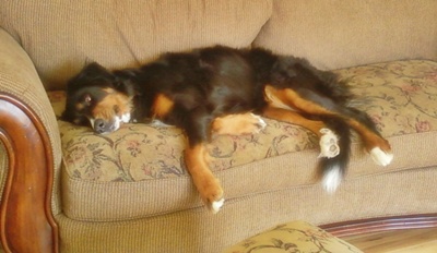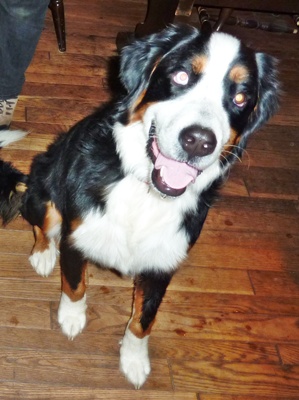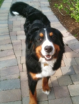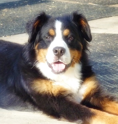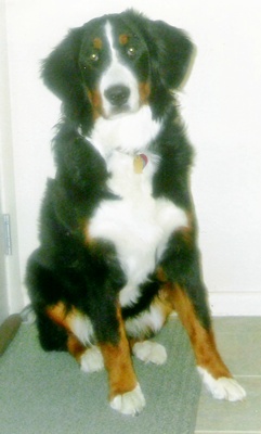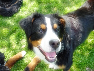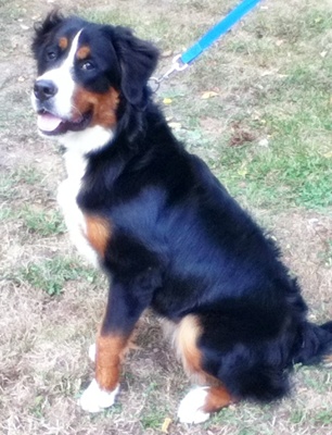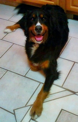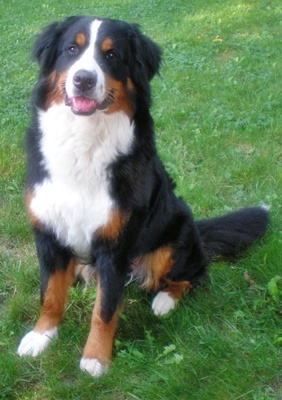 T-Bone as we are calling him was found starving and turned into the pound. He weighed 38 pounds. It was thought he was 1.5 to 2 years old but we think he is more like 10 months.So we are picking his new birthday as Cinco de Mayo, May 5th, 2011. He still has puppy hair on his head and is not lifting a leg yet and not too developed. He is a very small Berner for a male. This may be due to malnutrition for an extended period of time. We don’t think he was on his own for log, so the neglect must have started in the old home. He knows sit,shake, speak and some other commands.