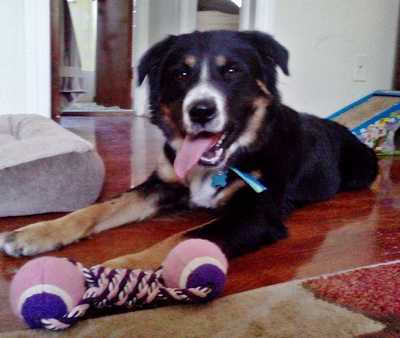 UPDATE 4/26/12 Abe is doing great. We have found toys that he CAN play with and not eat or destroy. He has really enjoyed being part of our family and getting attention when ever he wants it. We think that is new for him. He loves to play with T-bone, Molly and Charley our Golden. He still gets bored and will find something to chew on, so we have bones and such fo him to use. He will grab a pillow off the couch and take it outside to play tug with, so we have to “trade-up” to get it form him. Abe is a very loving boy and has really warmed up to me (Bruce) wanting to be with me all the time.