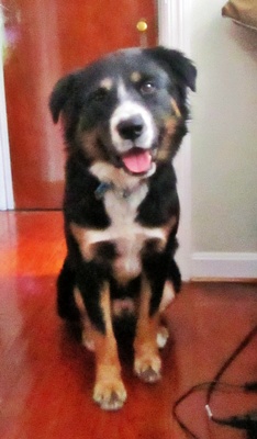 Here are some comments fron his foster Mom: I work at a community college near Cleveland in the Vet Tech department taking care of the animals they house for the labs (learning purposes only!) Two weeks ago we got our new round of dogs and cats for the year. I immediately fell in love with a Bernese mix we named “Bentley”. He is sweet, playful, kind, smart, and over-all a wonderful dog. He has been with me about two days now. He is a delight, very sweet, does not growl at any human we have come into contact with on (and there have been many since we live in the city) The only aggression I see in Bentley is towards my cat.